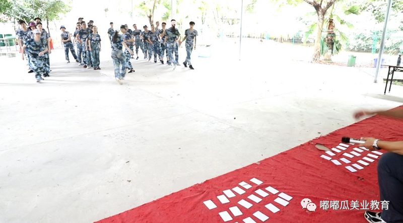 这个活动是让各小分队在一定时间内,从起点冲刺到台阶上,一次一张牌,去解码教练心里的顺序牌,以其中用时最短的一组成绩定夺各队的胜负。